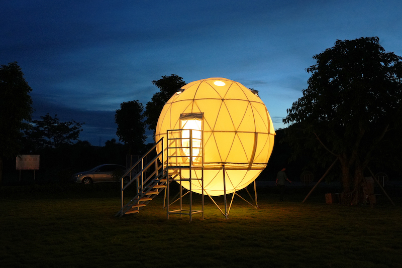 スフィアテントは、球体フォルムが印象的なデザインテントです。浮遊感のある姿は自然と調和し、夜には光り輝く満月のような美しい空間を演出します。