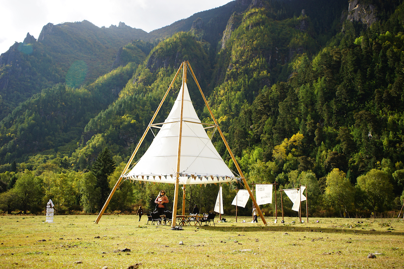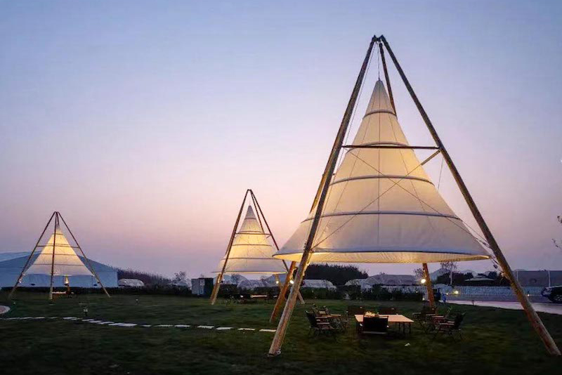 木を使った骨組みに白い布を張った幻想的なティピ型テント。夜はライトアップすることで、非日常の幻想的な雰囲気を演出します。